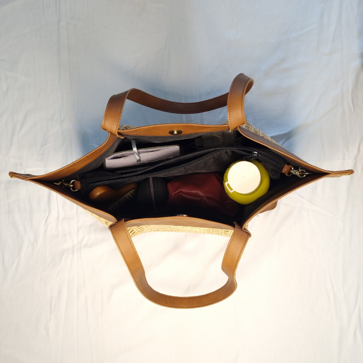 ECO-FRIENDLY MATERIALS: Crafted from sustainable cane and vegan leather, this tote bag is an environmentally friendly choice.